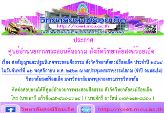 ประกาศ ศูนย์อำนวยการพระสอนศีลธรรม สังกัดวิทยาลัยสงฆ์ร้อยเอ็ด เรื่อง ต่อสัญญาและปฐมนิเทศพระสอนศีลธรรม สังกัดวิทยาลัยสงฆ์ร้อยเอ็ด ประจำปี ๒๕๖๔ ในวันจันทร์ที่ ๑๖ พฤศจิกายน พ.ศ. ๒๕๖๓