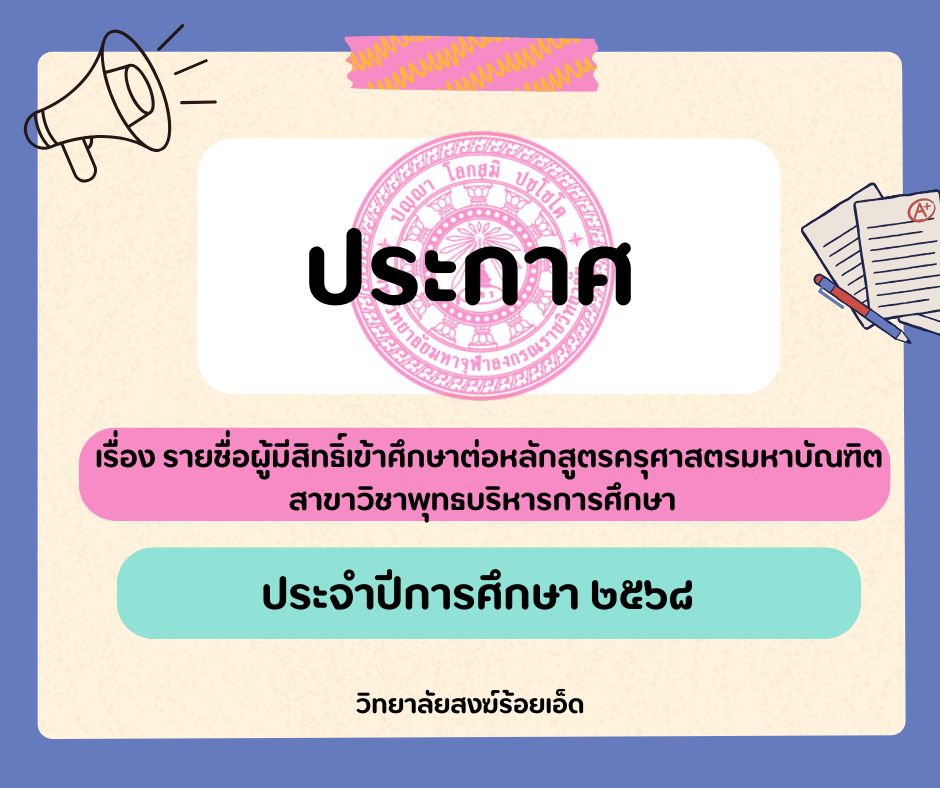 Home ข่าวสารประชาสัมพันธ์ ประกาศวิทยาลัยสงฆ์ร้อยเอ็ด มหาวิทยาลัยมหาจุฬาลงกรณราชวิทยาลัย เรื่อง รายชื่อผู้มีสิทธิ์เข้าศึกษาต่อหลักสูตรครุศาสตรมหาบัณฑิต สาขาวิชาพุทธบริหารการศึกษา รอบที่ ๑ ประจำปีการศึกษา ๒๕๖๘
