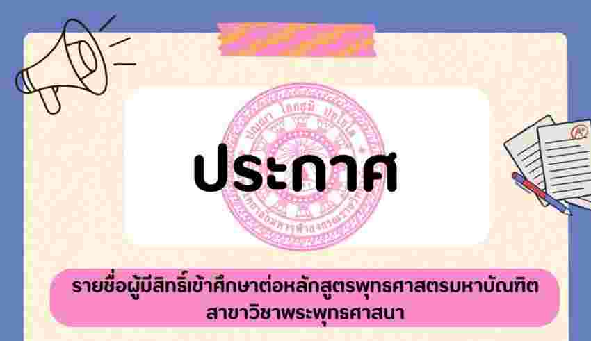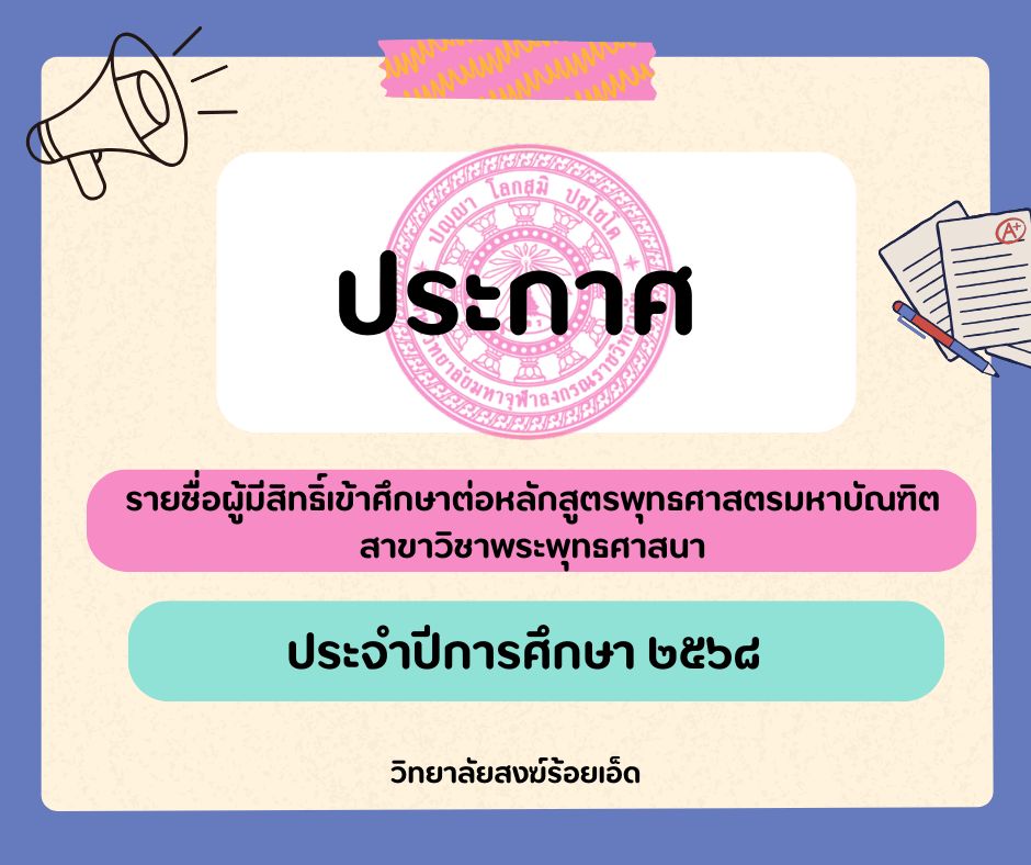 Home ข่าวสารประชาสัมพันธ์ ประกาศวิทยาลัยสงฆ์ร้อยเอ็ด มหาวิทยาลัยมหาจุฬาลงกรณราชวิทยาลัย เรื่อง รายชื่อผู้มีสิทธิ์เข้าศึกษาต่อหลักสูตรพุทธศาสตรมหาบัณฑิต สาขาวิชาพระพุทธศาสนา ประจำปีการศึกษา ๒๕๖๘