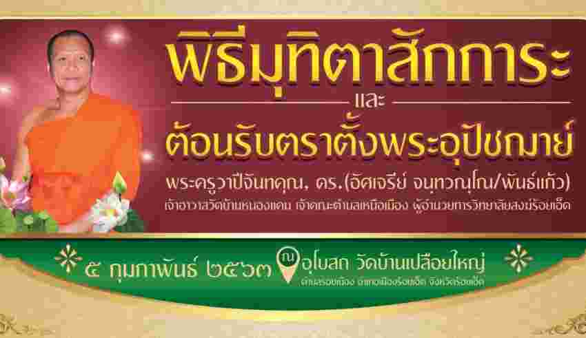 พุทธศาสนิกชนทุกท่าน ได้ร่วมพิธีมุทิตาสักการะ และต้อนรับตราตั้งพระอุปัชฌาย์ พระครูวาปีจันทคุณ, ดร. (อัศเจรีย์ จนฺทวณฺโณ/พันธ์แก้ว) เจ้าคณะตำบลเหนือเมือง เจ้าอาวาสวัดบ้านหนองแคน และผู้อำนวยการวิทยาลัยสงฆ์ร้อยเอ็ด ในวันพุธที่ ๕ กุมภาพันธ์ พ.ศ.๒๕๖๓ เวลา ๑๙.๓๐ น. เป็นต้นไป ณ อุโบสถวัดบ้านเปลือยใหญ่ ตำบลรอบเมือง อำเภอเมืองร้อยเอ็ด จังหวัดร้อยเอ็ด