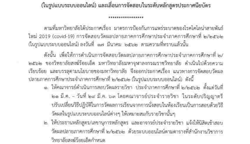เรื่อง แนวทางการจัดสอบวัดผลปลายภาคการศึกษาประจำภาคการศึกษาที่ ๒/๒๕๖๒ (ในรูปแบบระบบออนไลน์) และเลื่อนการจัดสอบในระดับหลักสูตรประกาศนียบัตร ตามเอกสารแนบ