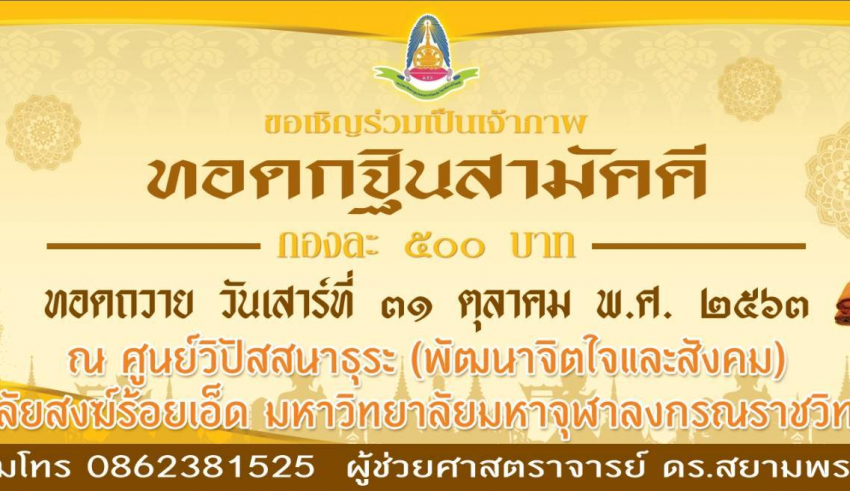 Home ข่าวสารประชาสัมพันธ์ วิทยาลัยสงฆ์ร้อยเอ็ด ขอเชิญร่วมเป็นเจ้าภาพ ทอดกฐินสามัคคี ทอดถวาย ในวันเสาร์ที่ ๓๑ ตุลาคม พ.ศ. ๒๕๖๓ ณ ศูนย์วิปัสสนาธุระ (พัฒนาจิตใจและสังคม) วิทยาลัยสงฆ์ร้อยเอ็ด มหาวิทยาลัยมหาจุฬาลงกรณราชวิทยาลัย