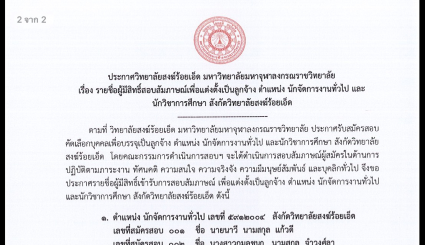 Home ข่าวสารประชาสัมพันธ์ ประกาศวิทยาลัยสงฆ์ร้อยเอ็ด มหาวิทยาลัยมหาจุฬาลงกรณราชวิทยาลัย เรื่อง รายชื่อผู้มีสิทธิ์สอบสัมภาษณ์เพื่อแต่งตั้งเป็นลูกจ้าง ตำแหน่ง นักจัดการงานทั่วไป และนักวิชาการศึกษา สังกัดวิทยาลัยสงฆ์ร้อยเอ็ด
