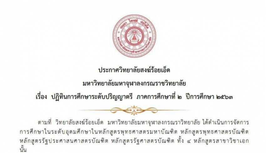 Home ข่าวสารประชาสัมพันธ์ ประกาศวิทยาลัยสงฆ์ร้อยเอ็ด มหาวิทยาลัยมหาจุฬาลงกรณราชวิทยาลัย เรื่อง ปฏิทินการศึกษาระดับปริญญาตรี ภาคการศึกษาที่ ๒ ปีการศึกษา ๒๕๖๓ รายละเอียดตามเอกสารแนบ