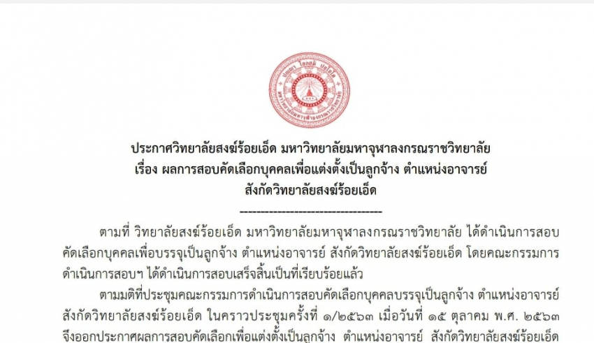 Home ข่าวสารประชาสัมพันธ์ ประกาศวิทยาลัยสงฆ์ร้อยเอ็ด มหาวิทยาลัยมหาจุฬาลงกรณราชวิทยาลัย เรื่อง ผลการสอบคัดเลือกบุคคลเพื่อแต่งตั้งเป็นลูกจ้าง ตำแหน่งอาจารย์ สังกัดวิทยาลัยสงฆ์ร้อยเอ็ด