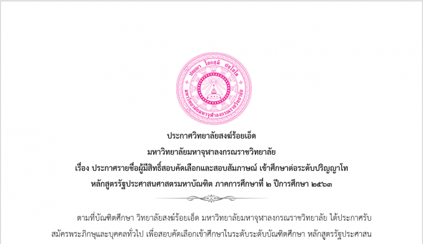 ตามที่บัณฑิตศึกษา วิทยาลัยสงฆ์ร้อยเอ็ด มหาวิทยาลัยมหาจุฬาลงกรณราชวิทยาลัย ได้ประกาศรับสมัครพระภิกษุและบุคคลทั่วไป เพื่อสอบคัดเลือกเข้าศึกษาในระดับระดับบัณฑิตศึกษา หลักสูตรรัฐประศาสนศาสตร์บัณฑิต (รป.ม.) สาขาวิชารัฐประศาสนศาสตร์ ประจำปีการศึกษา ๒๕๖๓