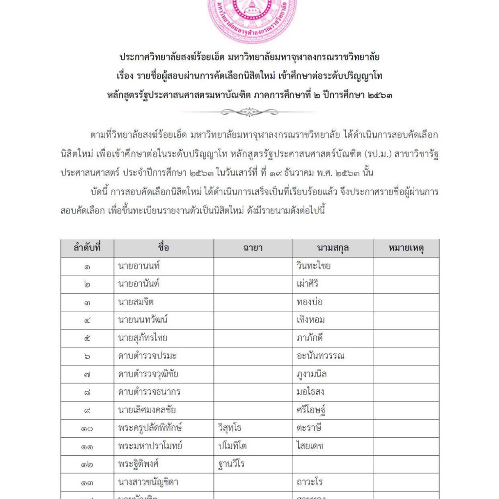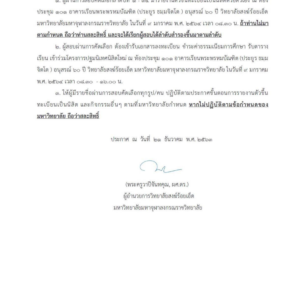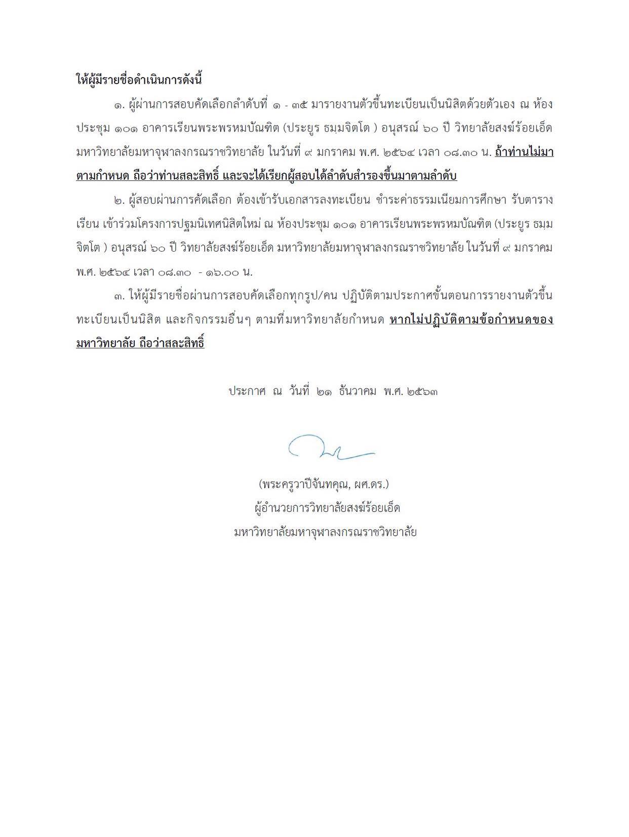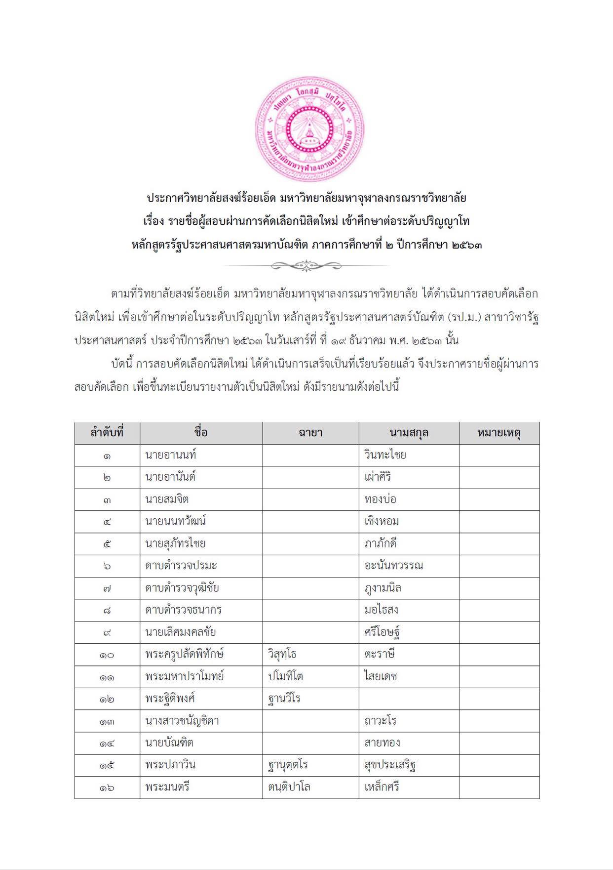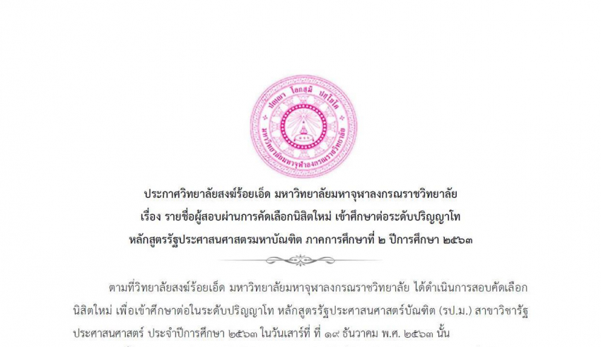 Home ข่าวสารประชาสัมพันธ์ ประกาศวิทยาลัยสงฆ์ร้อยเอ็ด มหาวิทยาลัยมหาจุฬาลงกรณราชวิทยาลัย เรื่อง รายชื่อผู้สอบผ่านการคัดเลือกนิสิตใหม่ เข้าศึกษาต่อระดับปริญญาโท หลักสูตรรัฐประศาสนศาสตรมหาบัณฑิต ภาคการศึกษาที่ ๒ ปีการศึกษา ๒๕๖๓ ให้ผู้มีรายชื่อมารายงานตัวขึ้นทะเบียนเป็นนิสิตด้วยตัวเอง ณ ห้องประชุม ๑๐๑ อาคารเรียนพระพรหมบัณฑิต (ประยูร ธมฺมจิตโต ) อนุสรณ์ ๖๐ ปี วิทยาลัยสงฆ์ร้อยเอ็ด มหาวิทยาลัยมหาจุฬาลงกรณราชวิทยาลัย ในวันที่ ๙ มกราคม พ.ศ. ๒๕๖๔ เวลา ๐๘.๓๐ น. ตามรายละเอียดเอกสารแนบ