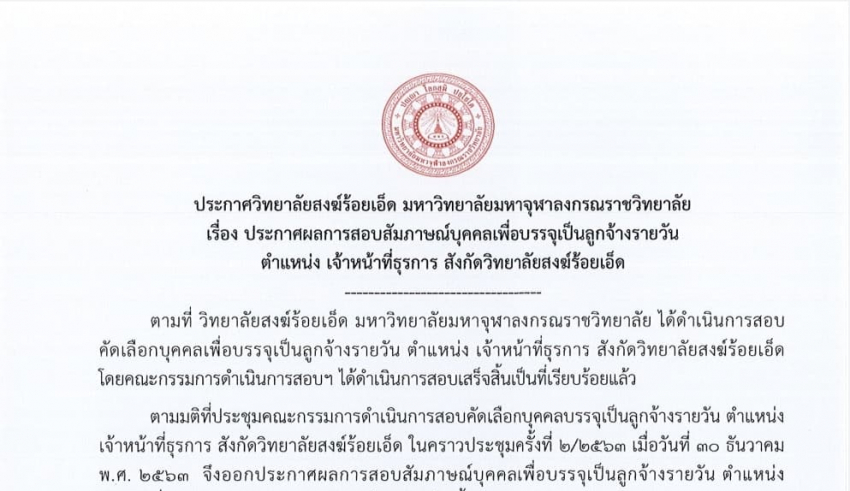 Home ข่าวสารประชาสัมพันธ์ ประกาศ วิทยาลัยสงฆ์ร้อยเอ็ด มหาวิทยาลัยมหาจุฬาลงกรณราชวิทยาลัย เรื่อง ประกาศผลการสอบสัมภาษณ์บุคคลเพื่อบรรจุเป็นลูกจ้างรายวัน ตำแหน่ง เจ้าหน้าที่ธุรการ สังกัดวิทยาลัยสงฆ์ร้อยเอ็ด รายละเอียดตามเอกสารแนบครับ