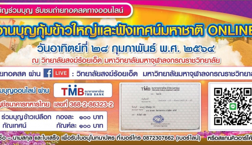 Home ข่าวสารประชาสัมพันธ์ วิทยาลัยสงฆ์ร้อยเอ็ด นิมนต์/เรียนเชิญ ร่วมงานบุญกุ้มข้าวใหญ่และฟังเทศน์มหาชาติ ONLINE ในวันอาทิตย์ที่ ๒๘ กุมภาพันธ์ พ.ศ. ๒๕๖๔ ณ วิทยาลัยสงฆ์ร้อยเอ็ด มหาวิทยาลัยมหาจุฬาลงกรณราชวิทยาลัย #ร่วมบุญออนไลน์ผ่านบัญชีธนาคารทหารไทยเลขที่ 368-2-86323-2