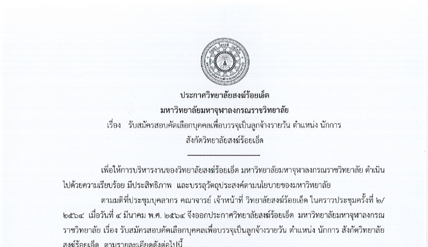 Home ข่าวสารประชาสัมพันธ์ ประกาศวิทยาลัยสงฆ์ร้อยเอ็ด มหาวิทยาลัยมหาจุฬาลงกรณราชวิทยาลัย เรื่อง รับสมัครสอบคัดเลือกบุคคลเพื่อบรรจุเป็นลูกจ้างรายวัน ตำแหน่ง นักการ สังกัดวิทยาลัยสงฆ์ร้อยเอ็ด