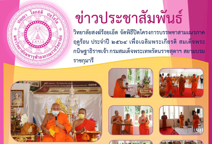 Home ข่าวสารประชาสัมพันธ์ วิทยาลัยสงฆ์ร้อยเอ็ด จัดพิธีปิดโครงการบรรพชาสามเณรภาคฤดูร้อน ประจำปี ๒๕๖๔ เพื่อเฉลิมพระเกียรติ สมเด็จพระกนิษฐาธิราชเจ้า กรมสมเด็จพระเทพรัตนราชสุดาฯ สยามบรมราชกุมารี