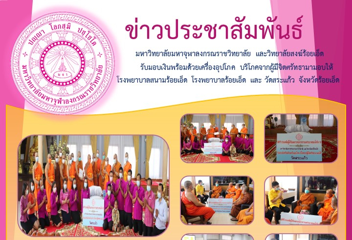 Home ข่าวสารประชาสัมพันธ์ มหาวิทยาลัยมหาจุฬาลงกรณราชวิทยาลัย และวิทยาลัยสงฆ์ร้อยเอ็ด รับมอบเงินพร้อมด้วยเครื่องอุปโภค บริโภคจากผู้มีจิตศรัทธามามอบให้ โรงพยาบาลสนามร้อยเอ็ด โรงพยาบาลร้อยเอ็ด และ วัดสระแก้ว จังหวัดร้อยเอ็ด