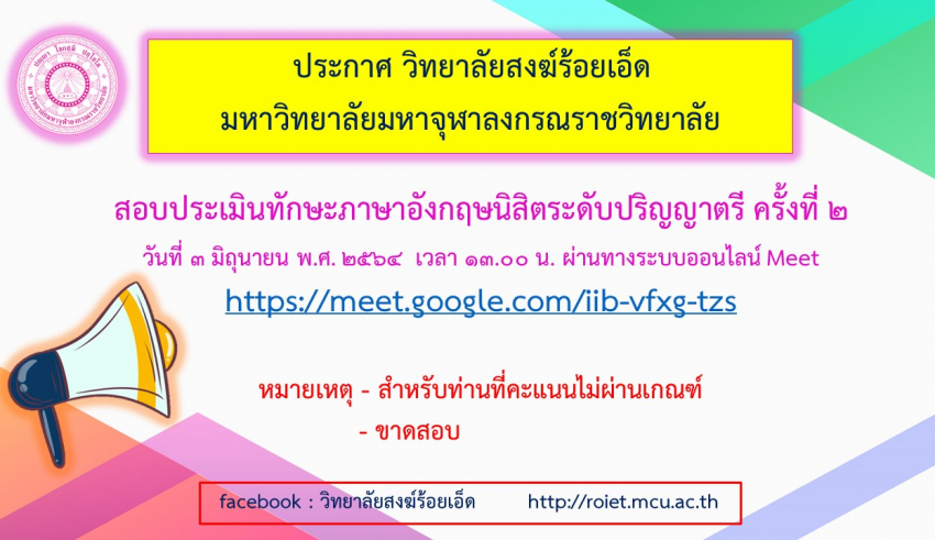 Home ข่าวสารประชาสัมพันธ์ ประกาศ วิทยาลัยสงฆ์ร้อยเอ็ด มหาวิทยาลัยมหาจุฬาลงกรณราชวิทยาลัย สอบประเมินทักษะภาษาอังกฤษนิสิตระดับปริญญาตรี ครั้งที่ ๒ วันที่ ๓ มิถุนายน พ.ศ. ๒๕๖๔ เวลา ๑๓.๐๐ น. ผ่านทางระบบออนไลน์ Meet https://meet.google.com/iib-vfxg-tzs หมายเหตุ - สำหรับท่านที่คะแนนไม่ผ่านเกณฑ์ – ขาดสอบ