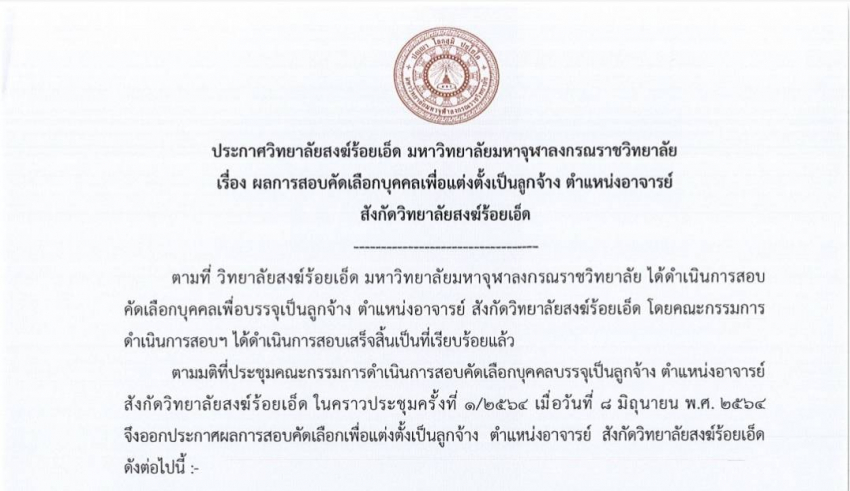 ประกาศวิทยาลัยสงฆ์ร้อยเอ็ด มหาวิทยาลัยมหาจุฬาลงกรณราชวิทยาลัย เรื่อง ผลการสอบคัดเลือกบุคคลเพื่อแต่งตั้งเป็นลูกจ้าง ตำแหน่งอาจารย์ สังกัดวิทยาลัยสงฆ์ร้อยเอ็ด