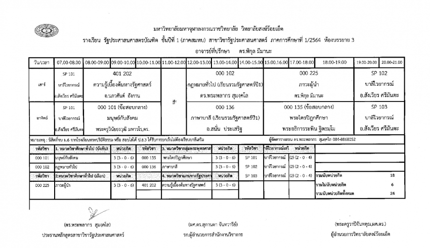 Home ข่าวสารประชาสัมพันธ์ ประกาศ วิทยาลัยสงฆ์ร้อยเอ็ด มหาวิทยาลัยมหาจุฬาลงกรณราชวิทยาลัย ตารางเรียน รัฐประศาสนศาสตรบัณฑิต ชั้นปีที่ 1 (ภาคสมทบ) สาขาวิชารัฐประศาสนศาสตร์ ภาคการศึกษาที่ 1/2564