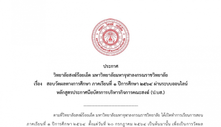 Home ข่าวสารประชาสัมพันธ์ ประกาศ วิทยาลัยสงฆ์ร้อยเอ็ด มหาวิทยาลัยมหาจุฬาลงกรณราชวิทยาลัย เรื่อง สอบวัดผลทางการศึกษา ภาคเรียนที่ ๑ ปีการศึกษา ๒๕๖๔ ผ่านระบบออนไลน์ หลักสูตรประกาศนียบัตรการบริหารกิจการคณะสงฆ์ (ป.บส.) ระหว่างวันที่ ๑๑ – ๑๒ ตุลาคม ๒๕๖๔