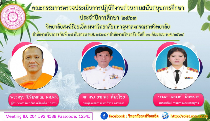 Home ข่าวสารประชาสัมพันธ์ คณะกรรมการตรวจประเมินการปฏิบัติงานส่วนงานสนับสนุนการศึกษา ประจำปีการศึกษา ๒๕๖๓ วิทยาลัยสงฆ์ร้อยเอ็ด มหาวิทยาลัยมหาจุฬาลงกรณราชวิทยาลัย สำนักงานวิชาการ วันที่ ๒๙ กันยายน พ.ศ. ๒๕๖๔ / สำนักงานวิทยาลัย วันที่ ๓๐ กันยายน พ.ศ. ๒๕๖๔