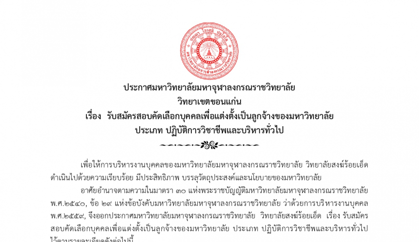 Home ข่าวสารประชาสัมพันธ์ ประกาศมหาวิทยาลัยมหาจุฬาลงกรณราชวิทยาลัย วิทยาเขตขอนแก่น เรื่อง รับสมัครสอบคัดเลือกบุคคลเพื่อแต่งตั้งเป็นลูกจ้างของมหาวิทยาลัย ประเภท ปฏิบัติการวิชาชีพและบริหารทั่วไป