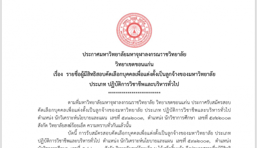 Home ข่าวสารประชาสัมพันธ์ ประกาศมหาวิทยาลัยมหาจุฬาลงกรณราชวิทยาลัย วิทยาเขตขอนแก่น เรื่อง รายชื่อผู้มีสิทธิสอบคัดเลือกบุคคลเพื่อแต่งตั้งเป็นลูกจ้างของมหาวิทยาลัย ประเภท ปฏิบัติการวิชาชีพและบริหารทั่วไป