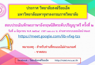 ประกาศ วิทยาลัยสงฆ์ร้อยเอ็ด มหาวิทยาลัยมหาจุฬาลงกรณราชวิทยาลัย สอบประเมินทักษะภาษาอังกฤษนิสิตระดับปริญญาตรี ครั้งที่ ๒ วันที่​ ๓ มิถุนายน​ พ.ศ. ๒๕๖๔ เวลา ๑๓.๐๐ น. ผ่านทางระบบออนไลน์ Meet https://meet.google.com/iib-vfxg-tzs หมายเหตุ​ -​ สำหรับท่านที่คะแนน​ไม่ผ่านเกณฑ์ – ขาดสอบ