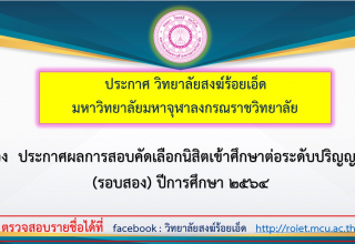 ประกาศ วิทยาลัยสงฆ์ร้อยเอ็ด มหาวิทยาลัยมหาจุฬาลงกรณราชวิทยาลัย เรื่อง ประกาศผลการสอบคัดเลือกนิสิตเข้าศึกษาต่อระดับปริญญาตรี (รอบสอง) ปีการศึกษา ๒๕๖๔