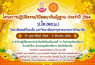 วิทยาลัยสงฆ์ร้อยเอ็ด จัดโครงการปฎิบัติธรรมวิปัสสนากัมมัฏฐาน ประจำปี ๒๕๖๔ ป.โท.(พธ.ม.) ในวันที่ ๑๙ กุมภาพันธ์ – ๕ มีนาคม ๒๕๖๔ ณ สำนักปฏิบัติติธรรมประจำจังหวัดร้อยเอ็ดแห่งที่ ๑๒ วัดป่าจตุรพักตรพิมาน ตำบลหัวช้าง อำเภอจตุรพักตรพิมาน จังหวัดร้อยเอ็ด ร่วมเป็นเจ้าภาพอุปถัมภ์ภัตตาหาร-น้ำปานะ ได้ที่ 020-0-6625535-5 ธ.ออมสิน ชื่อบัญชี วัดป่าเทศบาลจตุรพักตรพิมาน 411-3-43397-6 ธ.กรุงไทย ชื่อบัญชี ทุนป.โท วส.ร้อยเอ็ด หรือติดต่อ พระครูปลัดสมหมาย อตฺถสิทฺโธ,ดร. โทร 083-4549959